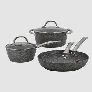 - Includes: 20cm Frypan, 28cm Frypan, 18cm Saucepan & 24cm Stockpot